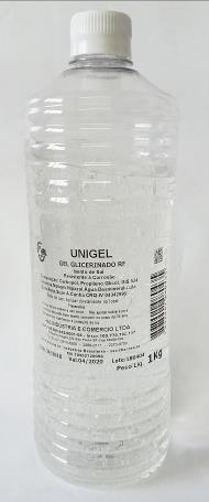 Gel Eletrocondutor Glicerinado para Radio Frequência, Fisioterapia, Fitness, marca "Unigel" , formulado para proporcionar excelente condução entre a pele e o equipamento, não irrita a pele e não danifica o equipamento. Isento de sal, isento de álcool, à base de água, pH neutro, não gorduroso, consistência adequada, inodoro, incolor. Fabricado com matérias primas importadas, todas com certificado de análise e procedência e água desmineralizada.